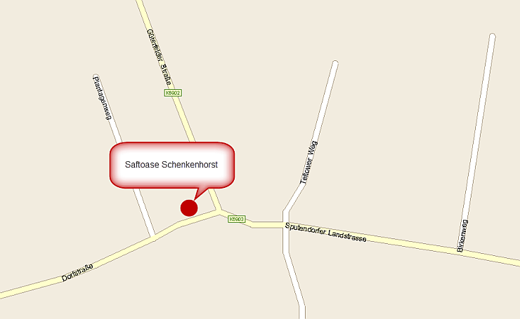 Die Saftoase Schenkenhorst liegt verkehrsgünstig im Dreieck Saarmund, Güterfelde und Ludwigsfelde. Rund 10 km südlich vom Berliner Stadtrand und 12 km vom Zentrum Potsdam entfernt. Wenn Sie Fragen zu unserem Standort haben, rufen Sie uns unter 0172 - 876 68 68 an. Wir helfen Ihnen gern weiter.