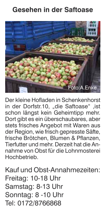 Die Saftoase Schenkenhorst genießt schon seit langem ein hohes Ansehen im regionalen Umfeld. Es ist uns eine besondere Ehre, Ihnen hier einige unsere Erwähnungen in der Regionalpresse vorstellen zu können.